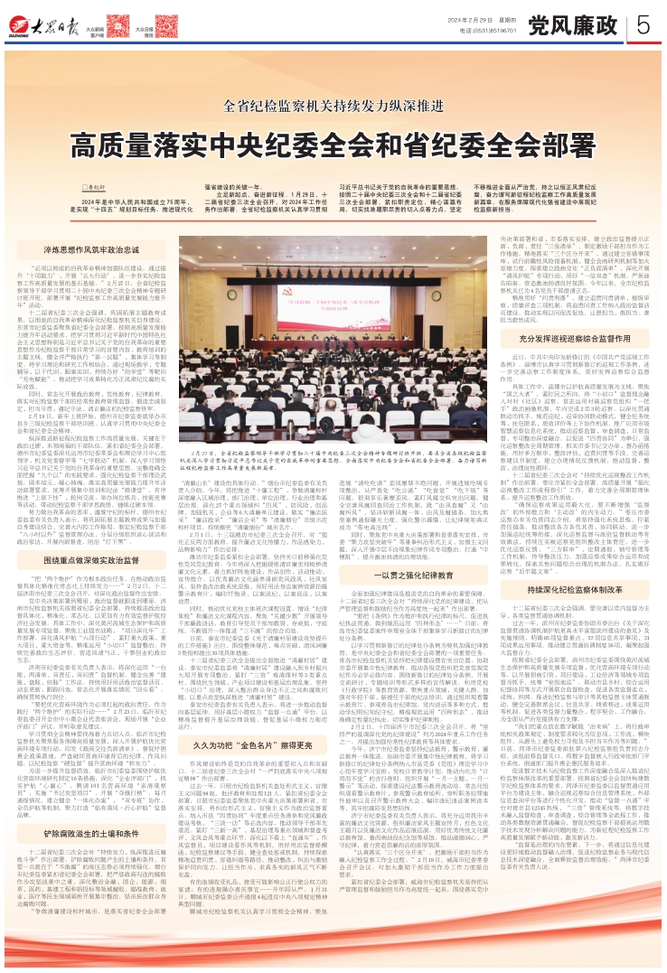2024年2月29日,大众日报“党风廉政”专版刊发《全省纪检监察机关持续发力纵深推进 高质量落实中央纪委全会和省纪委全会部署》。全文如下: