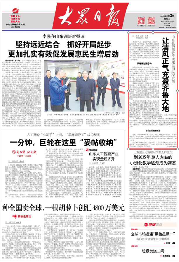 2026年2月3日,《大众日报》头版刊发文章《山东扎实推进清廉建设向纵深发展 让清风正气充盈齐鲁大地》。全文如下: