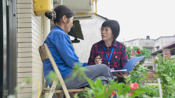 图为张爱莲(右)在辖区走访村民,核实信访举报问题线索。资料图片
