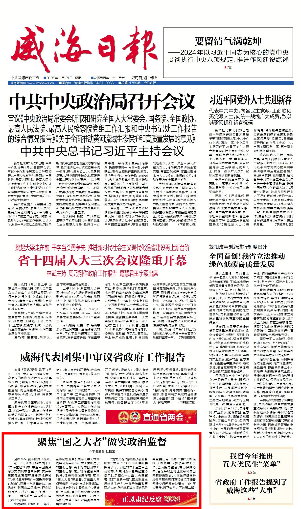 回眸2024,奋斗的脚步铿锵。 这一年,威海上榜中国十大“美好宜居”城市,荣登中国最具潜力文旅城市名单榜首,获评中国国际化营商环境建设标杆城市,连续五年蝉联“中国最具幸福感城市”,环境空气质量连续九年稳定达到国家二级标准,粮食播种面积、总产、单产保持“三增”……“精致城市·幸福威海”建设迈上新台阶。 忠诚履职、监督护航。一年来,全市纪检监察机关深入学习贯彻落实习近平总书记关于党的建设的重要思想、关于党的自我革命的重要思想,充分发挥监督保障执行、促进完善发展作用,聚焦“国之大者”强监督,突出重大专项强带动,完善制度机制强保障,持续推进政治监督具体化、精准化、常态化,有力推动全市各级党组织和党员干部坚定践行“两个维护”,为全市经济社会高质量发展保驾护航。 “国之大者”始终是政治监督的聚焦方向。2024年,市纪委监委围绕学习贯彻党的二十届三中全会精神,聚焦习近平总书记重要指示批示和党中央重大决策部署,紧盯“三新一高”、因地制宜发展新质生产力、一揽子增量政策落地实施、防范化解重点领域风险等重要任务,紧扣市委“大抓经济、大抓基层、大抓落实”中心工作,全面跟进监督,有力保障落实。督促开展土地征收领域突出问题排查整治,扎实做好虚增耕地等问题追责问责和省级环保督察移交问题调查处置等工作,压实责任、纠正偏差。坚决查处“七个有之”问题,营造风清气正政治生态。 位于高区的峒岭河、初村河水清岸美、风景如画。此前群众反映的入海排污、河道堵塞等问题已得到有效整改。每逢节假日,还有不少市民游客前来游玩。这一美丽“蝶变”,得益于黄河重大国家战略专项监督的扎实推进。如今,河道管护情况、河长制落实情况已被纳入相关职能部门、镇街政治监督活页动态监督,长效守护“水清河畅”。 着眼于发挥黄河重大国家战略专项监督牵引作用,市纪委监委健全完善重大专项监督综合协调机制,统筹开展乡村振兴、工程建设招投标、生态环境行政执法等领域腐败和作风问题专项整治,推动相关领域深入整改,先后查处一批落实责任不力、违纪违法问题,确保黄河重大国家战略在威海落实落地。 把推动优化营商环境作为政治监督的重要内容,连续第五年开展“清风护航”助力优化营商环境专项行动,聚焦政务服务、市场秩序、要素保障等,明确16项监督措施,制定《政商交往正负面清单》《清廉民企建设工作指引》,突出涉企服务、涉企执法、涉企诉求等重点,共查处损害营商环境问题198起、212人,助力营造更加公平公正的经济社会发展环境。 为推进政治监督具体化、精准化、常态化,市纪委监委打出了“3+2”政治监督体系保障“组合拳”,即深化运用“一台账、两清单、双责任、双问责”监督机制、政治监督活页监测机制、政治监督提示提醒机制,用好用实党内谈话、廉情通报载体,明责、督责、评责、问责的责任链条更加严密。 一年来,由市委主要领导带头、市纪委负责人参与,与区市、市直部门“一把手”开展廉政谈话;制定《关于深化运用“廉情通报”机制的工作办法》,向市级领导班子成员制发通报14期;一体做好市县两级政治监督活页“建管用”工作,将主题教育、集中整治等各类成果动态纳入、规范管理……管党治党政治责任持续压实。 攥指成拳聚合力。深入推动各类监督贯通协调,统筹纪律监督、监察监督、派驻监督、巡察监督“四项监督”,与人大、司法、审计等9类监督主体建立协作制度,与中央、省属驻威单位建立“五联五同”协作配合机制,构建起“4+9+N”大监督格局,更好护航各项重点任务、中心工作落地见效。