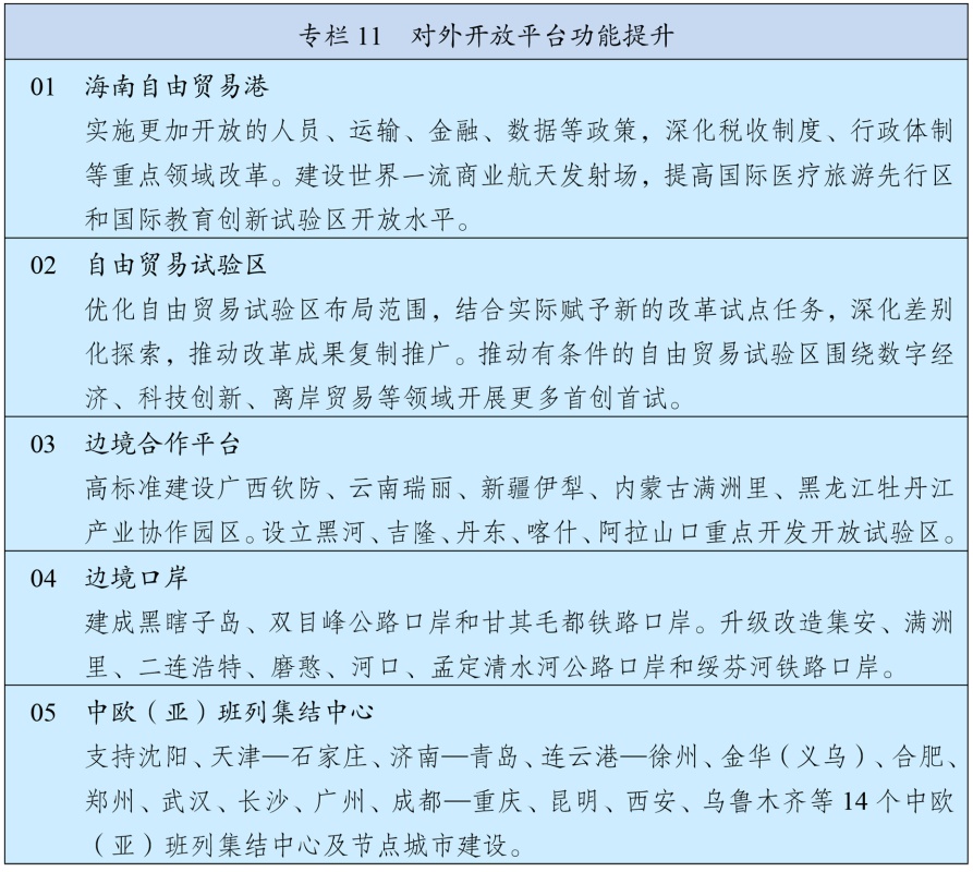 加强港澳与内地经贸、科技、人文等合作,完善便利港澳居民在内地发展和生活政策措施。有序推进与内地金融市场互联互通,深化与内地产学研创新协同。深化粤港澳合作,持续推动重点领域合作实现突破,促进港口、机场和轨道交通协同发展,建设广州至珠海(澳门)高铁,推进港深西部铁路前期工作。深化琴澳一体化发展,高质量建设前海、南沙、河套等重大合作平台。建设澳门国际机场横琴前置货站,推进澳琴国际教育(大学)城建设,支持澳门高校在横琴延伸办学。健全香港、澳门在国家对外开放中更好发挥作用机制,支持港澳深度参与高质量共建“一带一路”,发挥专业服务优势协助企业“走出去”。发挥港澳在中西文明交流互鉴中的重要窗口作用。
